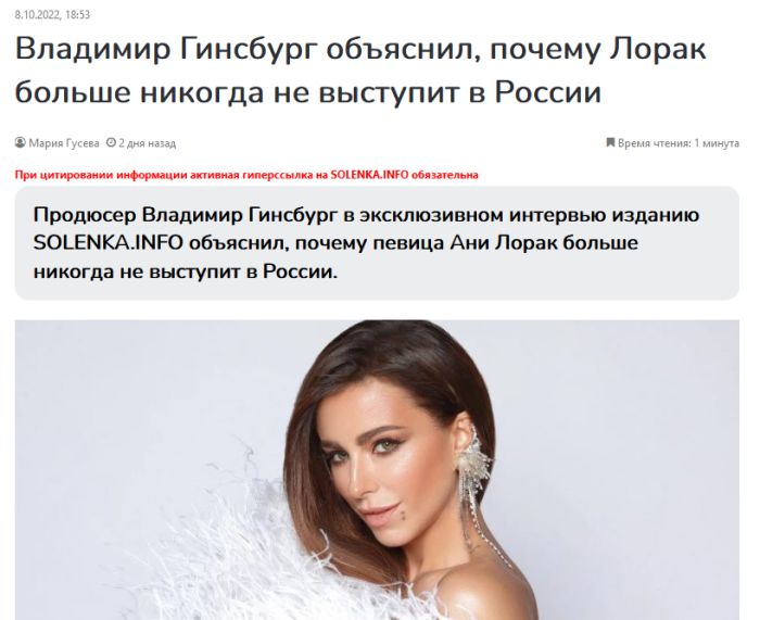 Новость о решении Лорак моментально разлетелась в СМИ. «Что сейчас творится в душе Лорак, представить трудно. Интересно, что, по последней информации, артистка рассталась с Егором Глебом. Они были вместе три года, и казалось, что дело идет к свадьбе. Однако сейчас, как утверждает источник, Ани собрала чемоданы и улетела к бывшему мужу Мурату Налчаджиоглу», — говорится в статье. А в рос “сми” тут же началась травля Ани Лорак. Кремлевские пропагандисты в своих текстах зачисляют её в “предатели”, распускают сплетни о том, что «обнищавшую» артистку бросил жених. Впрочем, надо сказать, Лорак ни разу публично не высказалась о российском вторжении. Лишь в начале февраля певица обтекаемо призвала к миру.