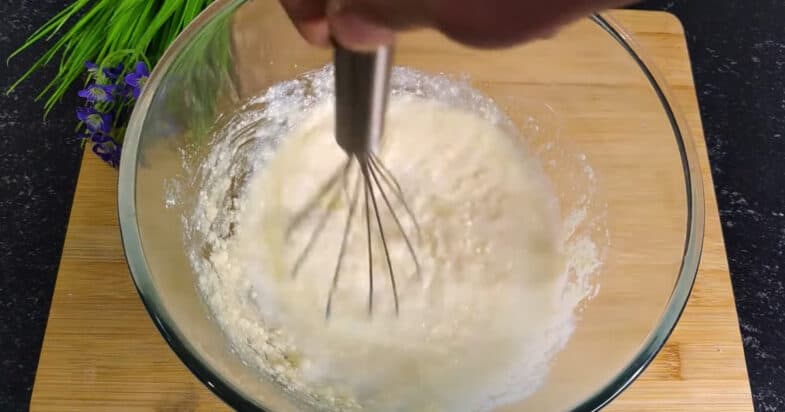 В миску разбиваю одно яйцо, все продукты комнатной температуры. Всыпаю 4 столовые ложки сахара, чайную ложку ванильного сахара и щепотку соли. Все перемешиваю венчиком до однородности. Кладу 100 грамм размягченного сливочного масла, перемешиваю. Вливаю 100 мл кефира и все соединяю.