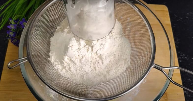 В сито всыпаю 260 граммов муки. Добавляю пакетик разрыхлителя 15 граммов. Просеиваю. Крупинки на дне сита высыпаю в миску, это лимонная кислота от разрыхлителя.