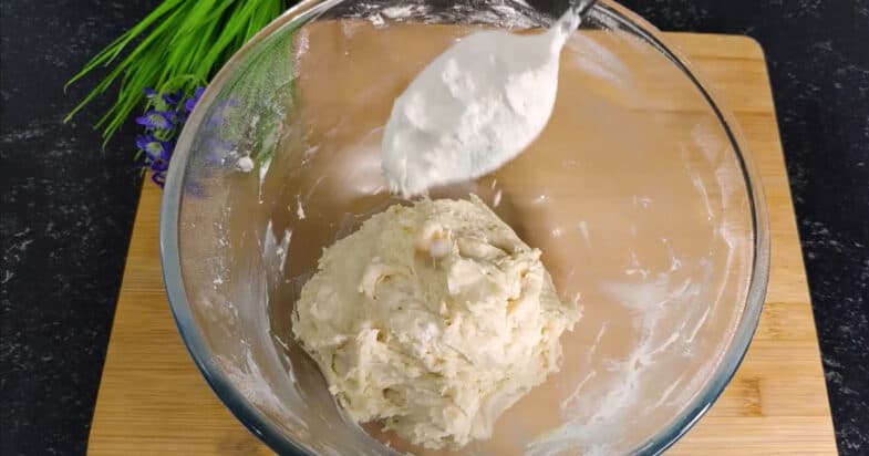 Замешиваю мягкое тесто, собираю его в однородную грудку. Подсыпаю муки 1-2 столовых ложки, тесто не должно сильно липнуть в руки. Кладу его в пакет и отправляю в морозилку на 10 минут или на пол часа в холодильник.