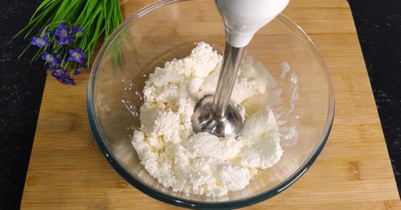 Для начинки беру творог 250 грамм любой жирности. Добавляю сахар 1 столовую ложку и ванильный сахар чайную ложку. Яйцо разделяют на желток и белок. Желток отставляю для смазки. Белок перевожу в сыр. Добавляю сметану 1 столовую ложку. Перебиваю все блендером.