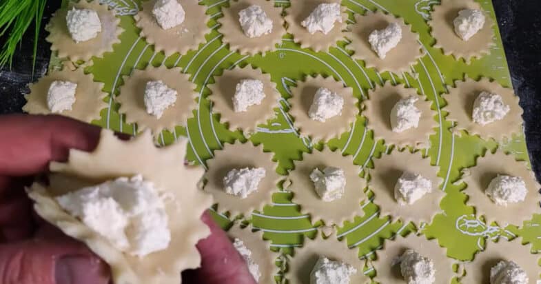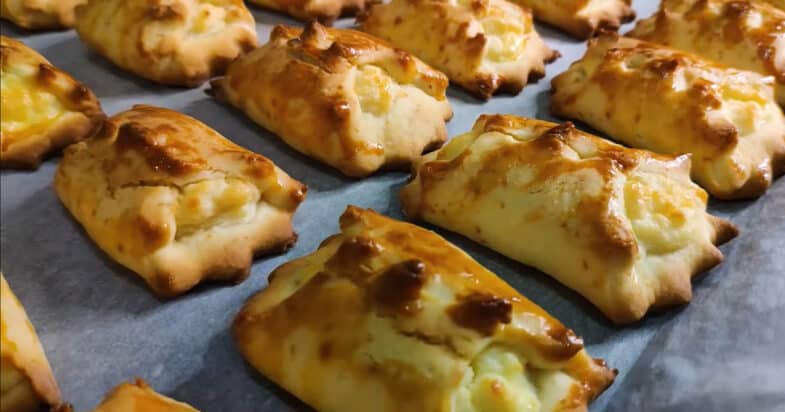 Тесто достаю из морозилки, потряхиваю его и рабочую поверхность мукой. Раскачиваю тесто в пласт толщиной 2-3 мм. Формой для кексов вырезаю заготовки для печенья. Выкладываю творожную начинку. Края печенья соединяю и защелкиваю.