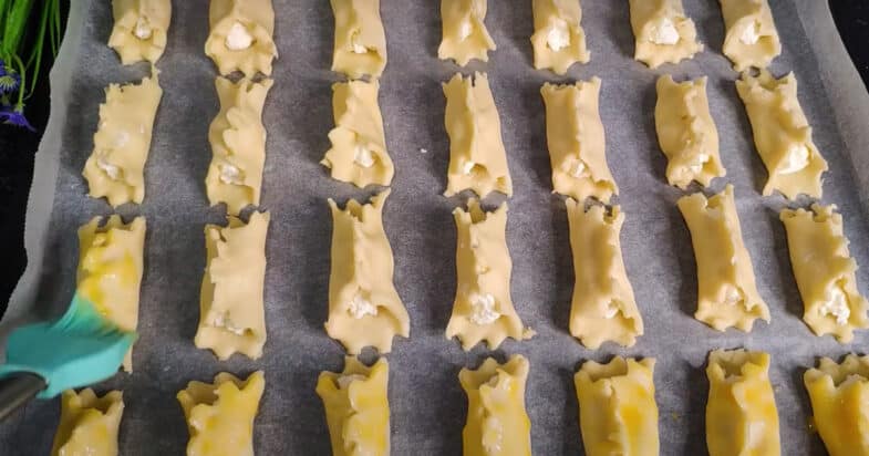 Форму застилаю бумагой для выпечки и выкладываю печенье. Верх печенья смазываю желтком. Отправляю выпекаться в разогретую до 180 духовку на 25-30 минут.
