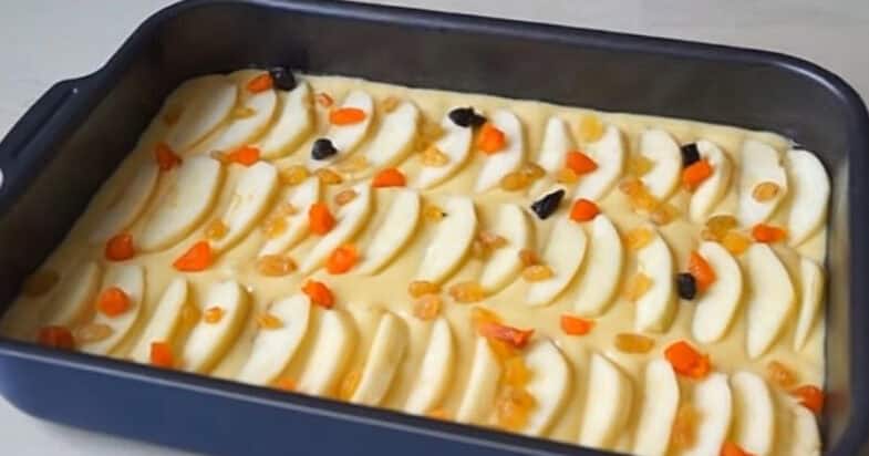Вливаю готовое тесто в форму для выпечки. Очищаю яблоки от кожуры, нарезаем их дольками. Выкладываю яблоки на тесто в форме. Посыпаю все сухофруктами. Отправляю форму в разогретую до 180 градусов духовку на 35-40 минут.