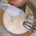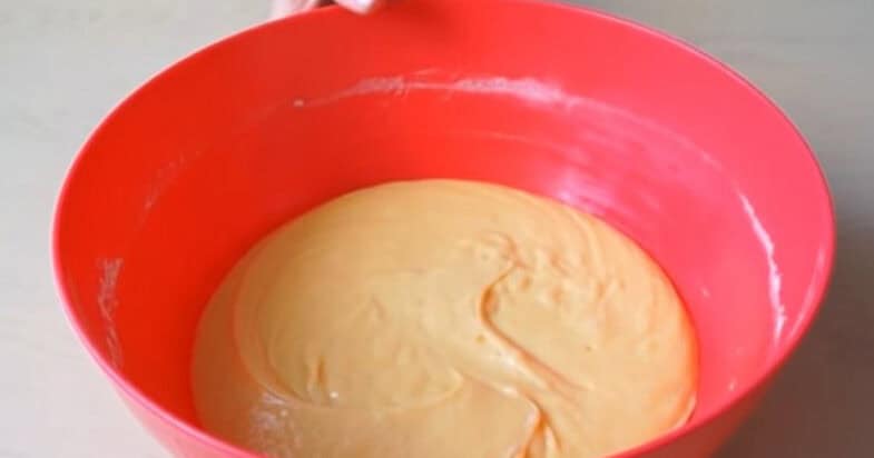 Смешиваю масло и кефир, всыпаю обычный и ванильный сахар. Перемешиваю все с помощью венчика. Отливаю 2 ст. л. смеси в стакан и отставляю в сторону. К смеси добавляю яйца, всыпаю муку и разрыхлитель. Взбиваю все миксером до получения однородной массы.