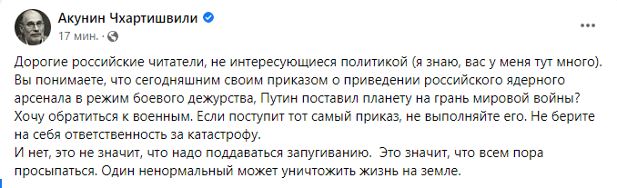«Дорогие российские читатели, не интересующиеся политикой (я знаю, вас у меня здесь много). Вы понимаете, что сегодняшним своим приказом о приведении российского ядерного арсенала в режим боевого дежурства Путин поставил планету на грань мировой войны?