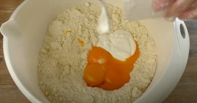 К муке добавляю холодное сливочное масло и растираю руками в крошку. Добавляю разрыхлитель, сахар и перемешиваю. Добавляю яичные желтки, сметану, замешиваю однородное тесто.