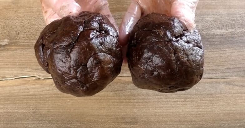 Ко второй части теста добавляю какао и замешиваю шоколадное тесто, теперь также делю на 2 равные части. Заворачиваю 2 части в пакет, одну кладу в холодильник на 30 минут, а вторую – в морозильную камеру на 30 минут.