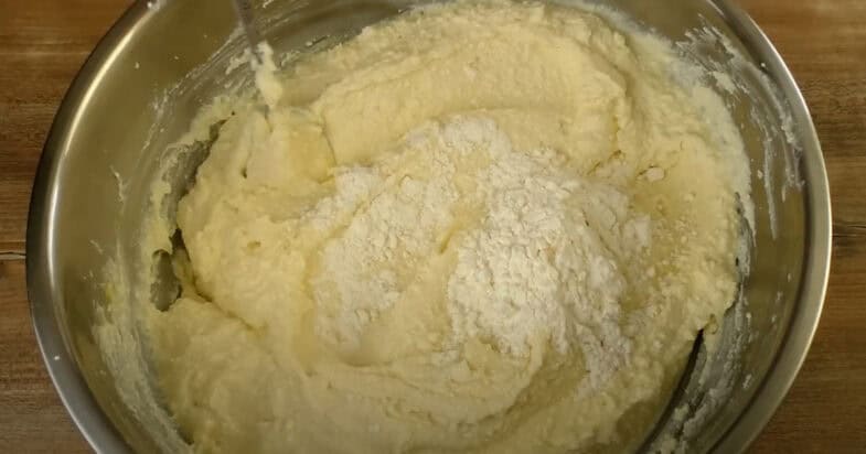 В сыр добавляю сахар, ванильный сахар, яйца и растопленное сливочное масло. Замешиваю до однородности блендером. Тогда добавляю пудинг и перемешиваю лопаткой.