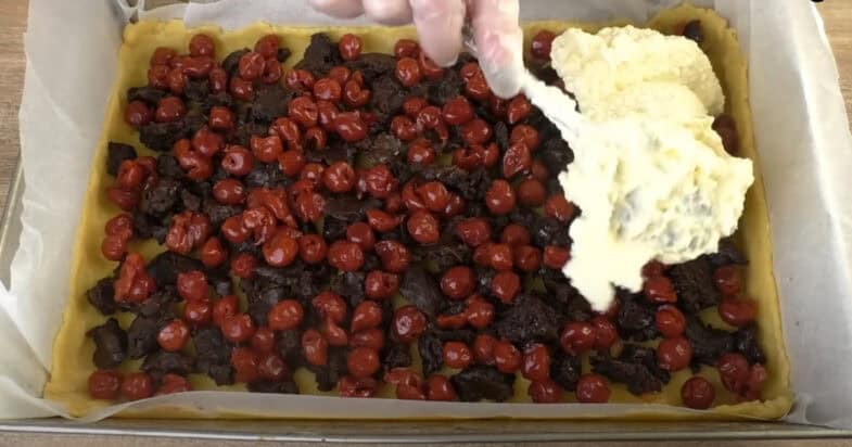 Светлое тесто из холодильника раскачиваю до размера формы 25 на 35 см. В форму выкладываю пергамент и тесто, формируя бортики. Поверх отрываю руками шоколадное тесто из холодильника. Также выкладываю вишни и всю творожную массу.
