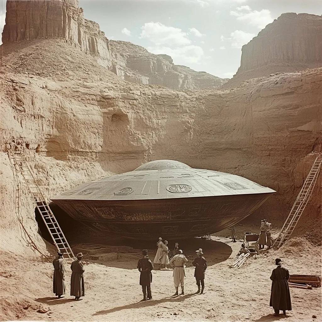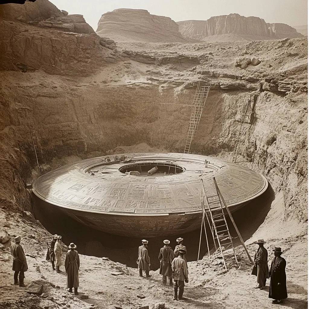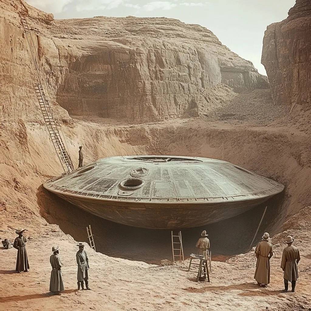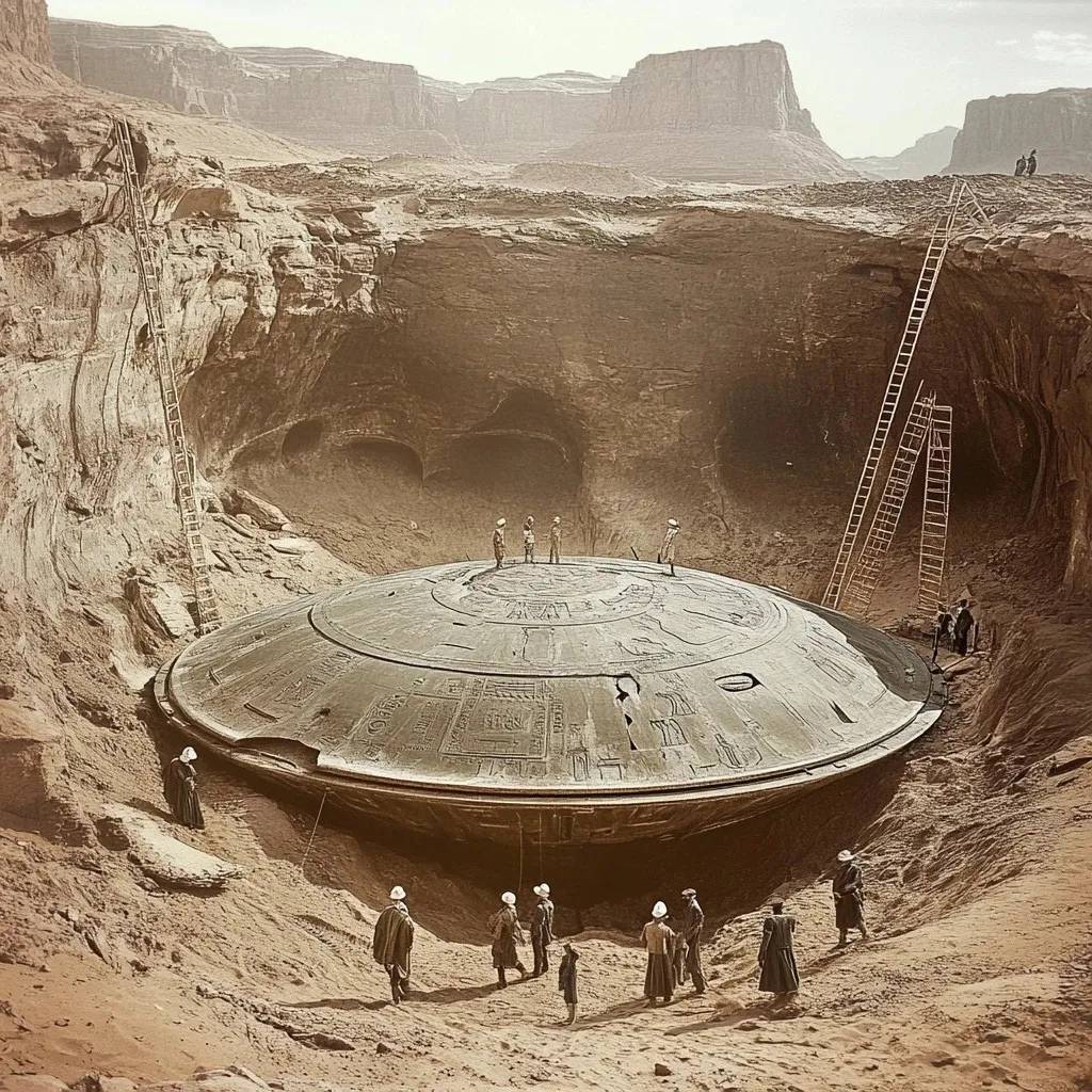Удивительное сооружение, частично засыпанное песком и окруженное остатками древних скальных образований, тщательно раскопала специальная команда археологов. Этот своеобразный объект, диаметром в несколько метров, имеет металлическую поверхность и сложные, казалось бы, внеземные гравировки. Его почти идеально круглая форма и массивные размеры натолкнули кое-кого на мысль, что это может быть своего рода древним транспортным средством — возможно даже давно утерянной реликвией забытой цивилизации.