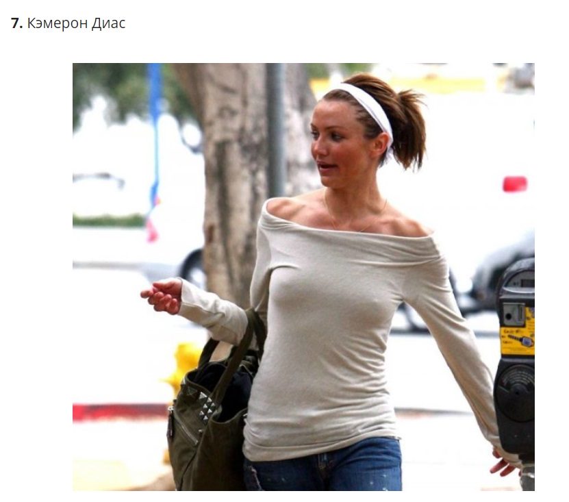Звёзды привыкли удивлять и эпатировать. И порой уже даже не замечают, как автоматически это делают как на публике, так и в обычной жизни. В частности, многие знаменитости не признают бюстгальтеры, так как во-первых, отсутствие этой детали помогает привлечь дополнительное внимание. А во-вторых, без лифчика лучше видно идеальную грудь, над которой зачастую трудится целая команда пластических хирургов. Что ж, возможно, звёзды имеют полное право хвастать своими прелестями. Или это всё же перебор? Как считаете? А пока вы формируете своё мнение, предлагаем изучить фото самых смелых и уверенных в себе звёзд, которые привыкли расхаживать без бюстгальтера. Возможно, так просто удобнее?..